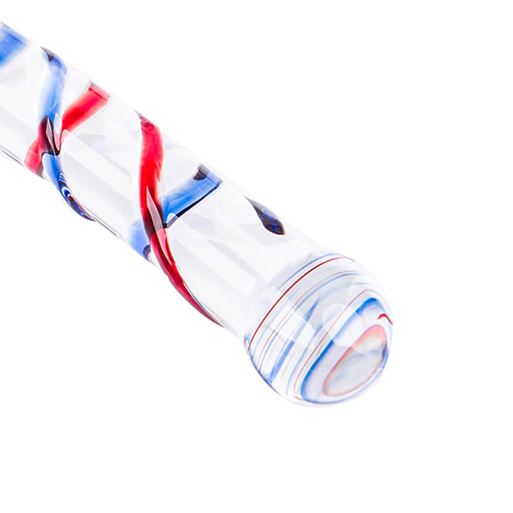 Pleasure awaits. This 7.9-inch spiral glass dildo features red & blue swirls. Smooth, waterproof design for versatile fun and easy cleaning. Shop now.
