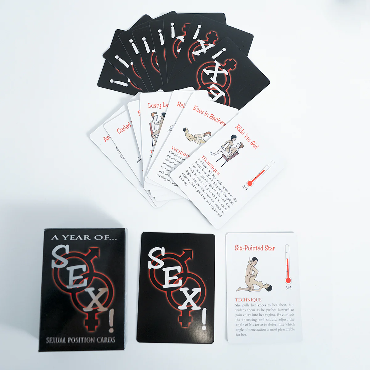 Are you seeking a more thrilling erotic experience? A Year of Sex Cards contains 54 different sexual positions for you to try! Inspired by the Kama Sutra, every position features a simple instruction and challenge rating from 1-5. Dare to try the difficult (5) technique to add more pleasure to your foreplay!
