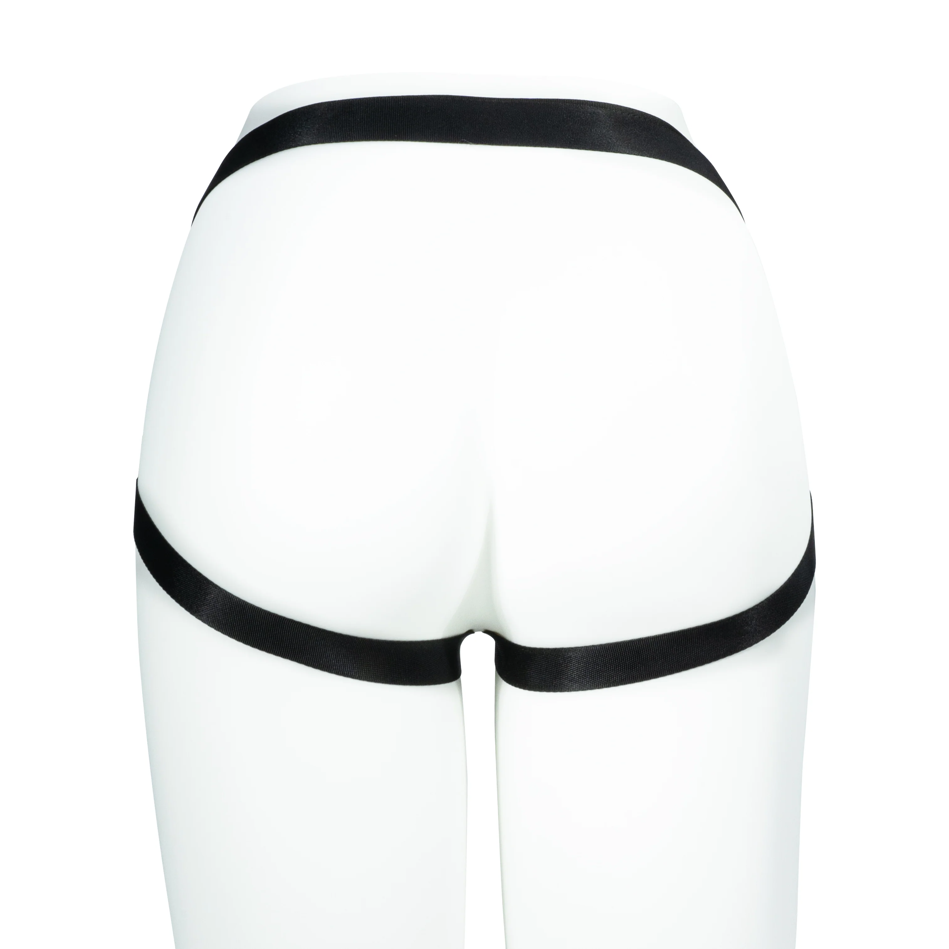 Black webbing harness for a secure, adjustable fit. Buckle closures, padded cup with rivets, and wide waist/thigh bands ensure comfort. Shop minimalist design.